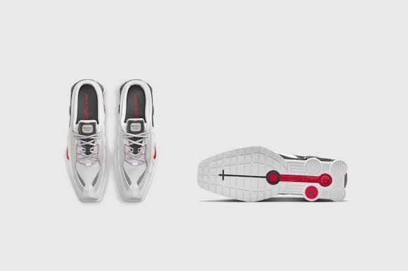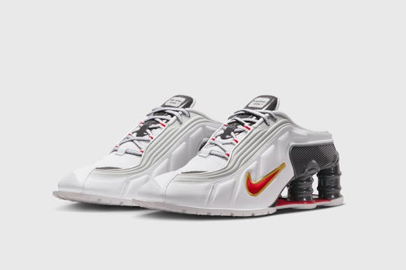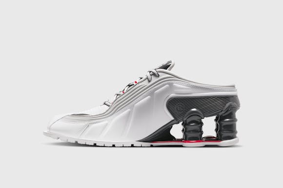 First unveiled at Martine Rose’s SS23 show in London, the Nike Shox MR4 Mule returns, continuing a collaboration defined by provocation and reinvention. A radical reinterpretation of the early 2000s Shox R4, the MR4 distorts familiar lines with an elongated form, pointed toe, and exaggerated heel – a silhouette that blurs the boundary between performance and fashion.