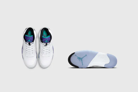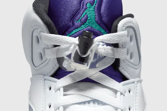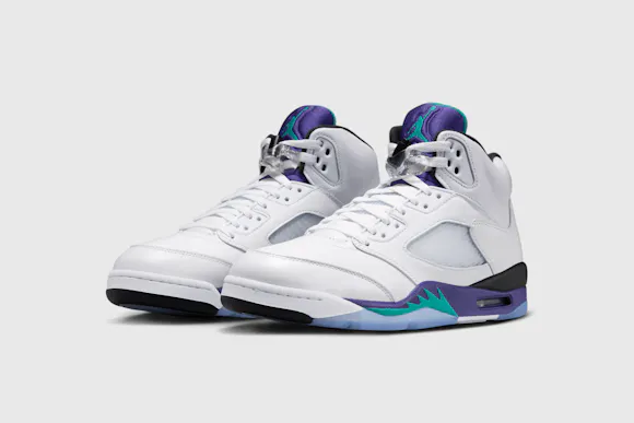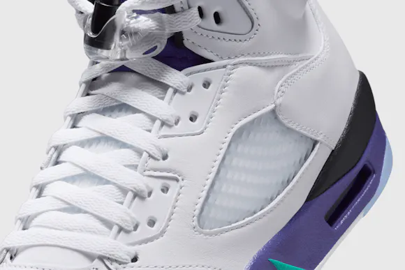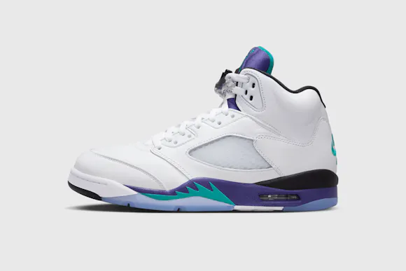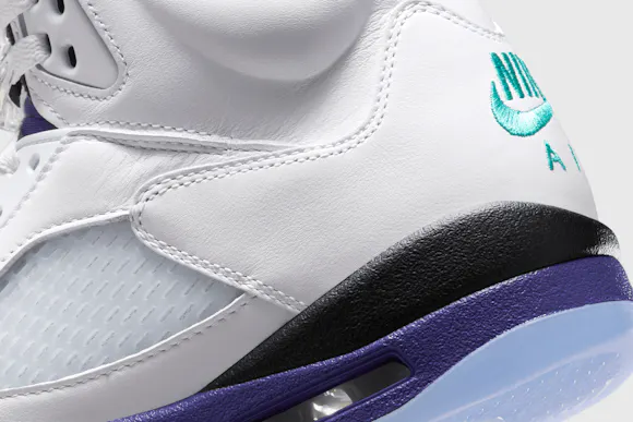 The AJ5 launched in 1990, and the 'Grape' colourway broke the mould on more conventional Jordan colours—white, red and black. The 'Grape' combines smooth white leather with Grape Ice and New Emerald accents—originally giving a nod to the nascent NBA team from MJ's home state of North Carolina. Earning instant acclaim in '90s pop culture, the timeless icon quickly cemented its status as a cultural phenomenon.